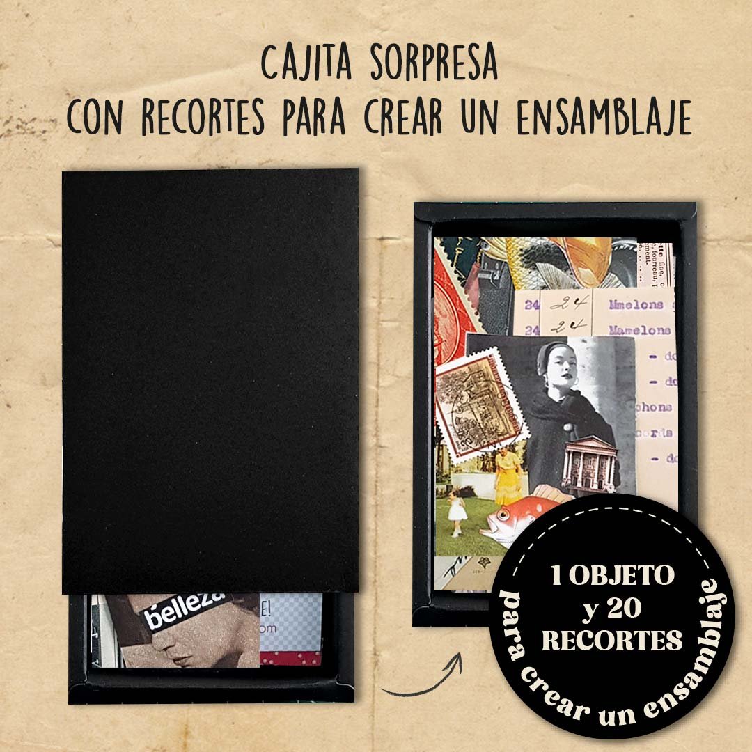 Cada cajita incluye un elemento único con el que podrás crear tu propio ensamblaje artístico.